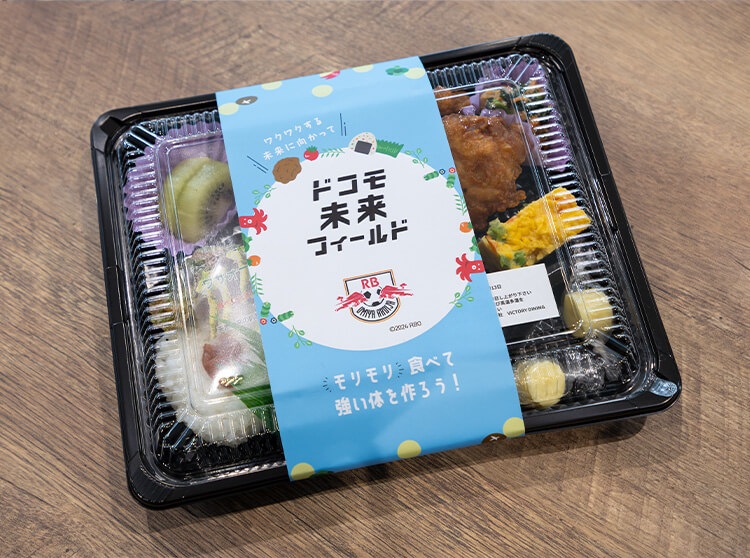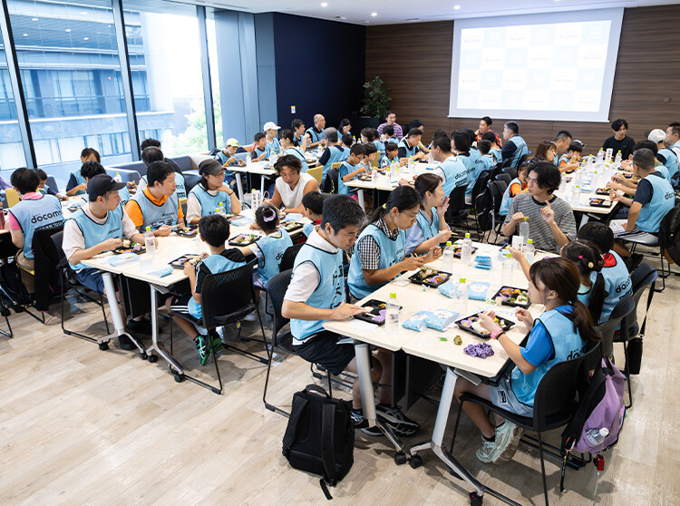 選手OBと一緒にランチタイム!公認スポーツ栄養士監修のドコモ未来フィールドオリジナルのスペシャルお弁当をみんなで楽しく、おいしくいただきました♪