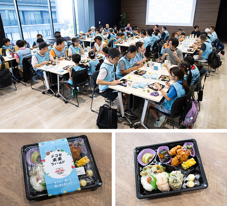 選手OBと一緒にランチタイム!公認スポーツ栄養士監修のドコモ未来フィールドオリジナルのスペシャルお弁当をみんなで楽しく、おいしくいただきました♪