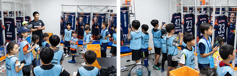試合前のロッカールームを見学させていただきました。これから試合に出る選手のユニフォームやスパイクが並んでいて、子どもたちは「すごい!」「こんな風になってるんだ!」と興味津々に見学していました。普段入ることができない場所で、プロの世界を間近に体験し、目を輝かせていました。