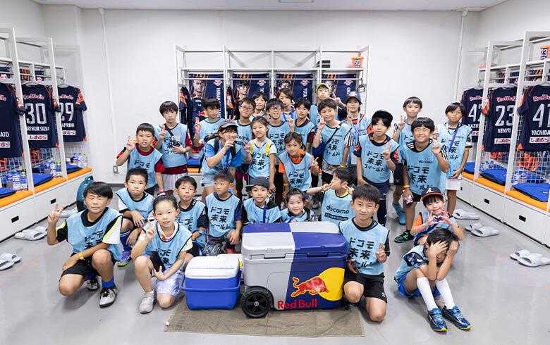 2025年9月13日(土)、ドコモがパートナーを務める「RB大宮アルディージャ」にご協力いただき、プレミアムな体験イベントを開催しました。サッカー好きやプロサッカー選手・プロサッカーの世界を目指す、抽選で当選したサッカー経験者29名の子どもたちを招待して、元プロサッカー選手にサッカーを教えてもらったり、試合前のロッカールームを見学したりと、ここでしか体験できない、「プロサッカーのセカイ」にふれてもらいました。
