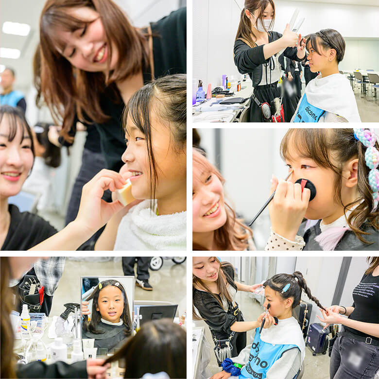 続いては、ヘアメイク体験!ステージ用のメイクと髪型に仕上げてもらいました♪「こんな髪型にしたい!」「この色のアイシャドウがいい!」という子どもたちのリクエストをあっという間に叶えてくれました。