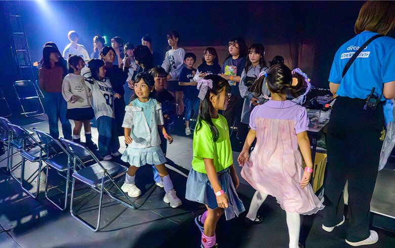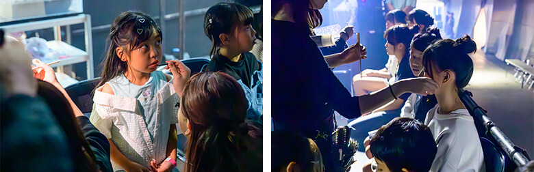 ステージ袖に移動した子どもたちはワクワクと緊張が入り交じった表情。ヘアメイクを直してもらう姿は本物のプロのようでした!子どもたちは「緊張するね」「大丈夫だよ!」などと声をかけあっていました。