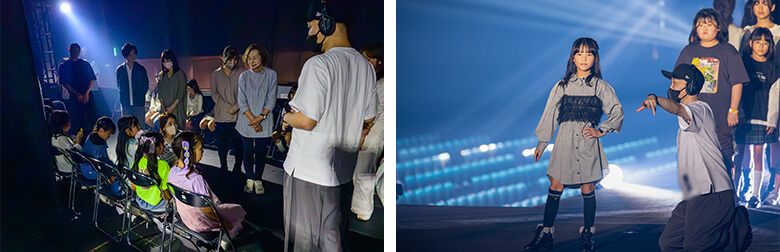 続いては、ステージのリハーサルを見学しました。本番と同じBGM、演出、カメラワークで進行し、モデルさんの立ち位置などもしっかりチェック。本番を成功させるためには入念な確認は欠かせません。子どもたちも、真剣にリハーサルの様子を見ていました。